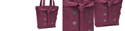 - contrast canvas bottom Exterior pocket Web handles Dimensions: 14.5"h x 14"w x 5.5"dNote: Bags not intended for use by children 12 and under. Includes a California Prop 65 and social responsibility hangtag.